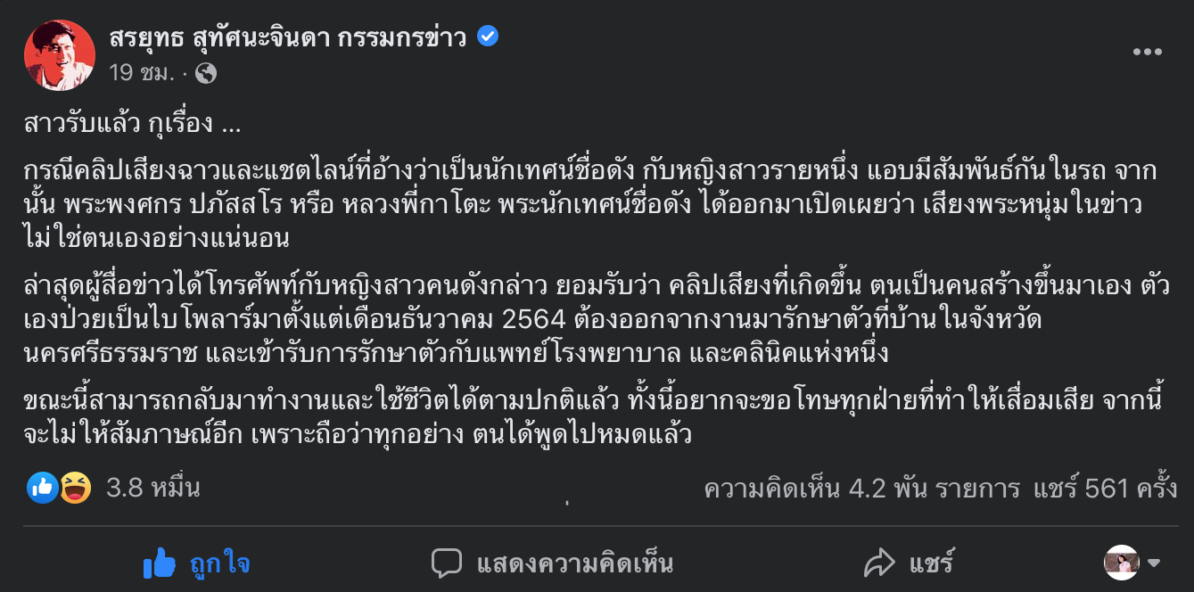 และวานนี้ (28 เม.ย. 65) ทางเพจ สรยุทธ สุทัศนะจินดา กรรมกรข่าว โพสต์ข้อความว่าสาว ตอง ยอมรับกุเรื่องอ้างตัวเอง เป็นไบโพลาร์มาตั้งแต่เดือนธันวาคม 2564 ต้องออกจากงานมารักษาตัวที่บ้านในจังหวัดนครศรีธรรมราช และคลิปเสียงที่เกิดขึ้นตนเองเป็นคนสร้างขึ้นมา ขณะนี้สามารถกลับมาใช้ชีวิตปกติแล้ว อยากขอโทษทุกฝ่ายที่ทำให้เสื่อมเสีย จากนี้ขอไม่ให้สัมภาษณ์อีกเพราะตอนเองพูดไปหมดแล้ว
