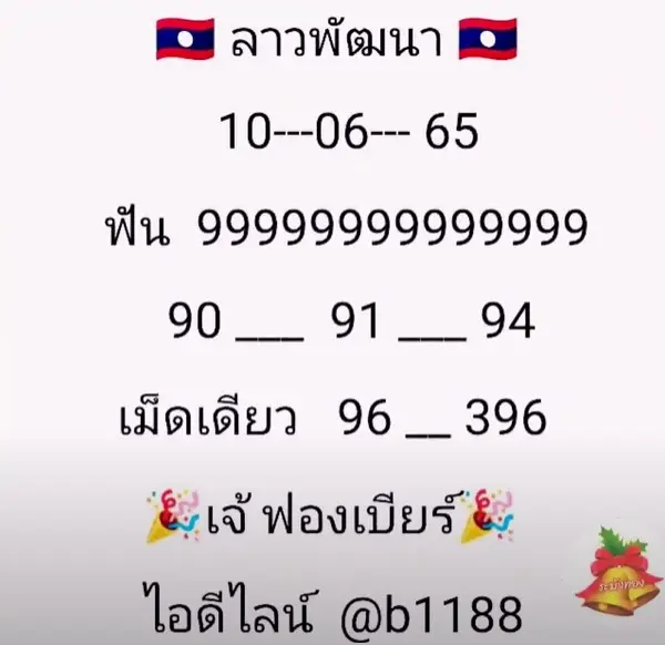 ซึ่งแนวทางหวยลาวพัฒนา งวดที่ 65 นั้น หวยลาว เจ๊ฟองเบียร์ แจกให้นั้น คือ ฟัน 9 90 – 91 – 94 เม็ดเดียว 96 – 396 นั่นก็ดันไปฟันตรงกับผลรางวัลหวยลาวพัฒนาในงวดนี้ ก็คือ รางวัล 2 ตัวล่าง 99 นั่นเอง