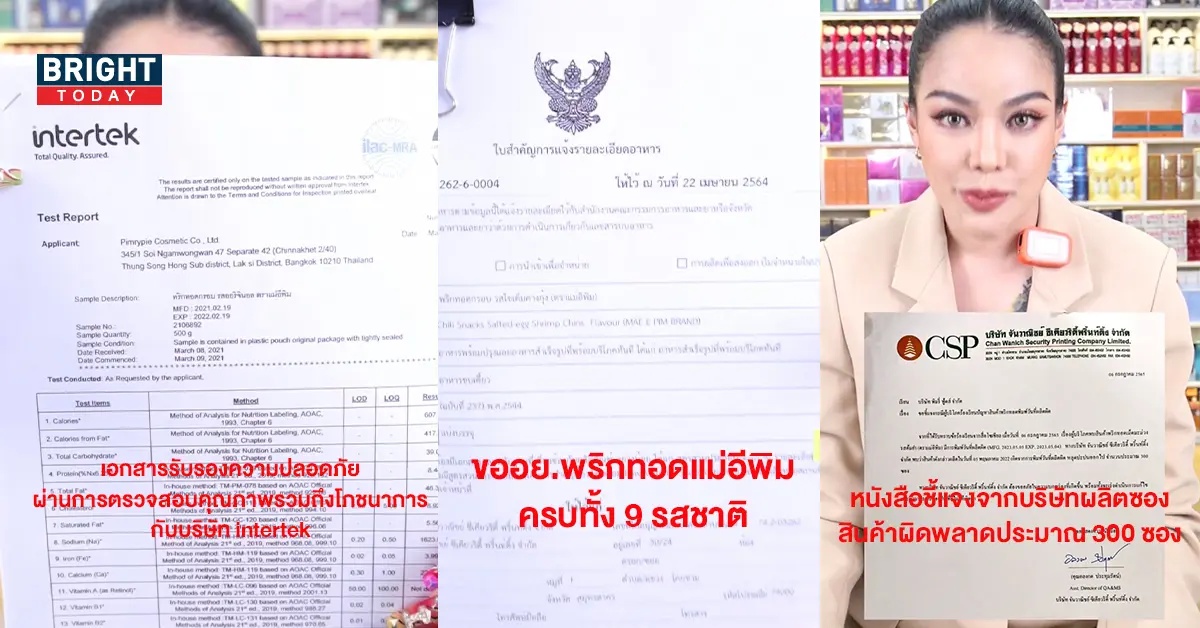 - และอีกหนึ่งหลักฐานคือ เอกสารรับรองความปลอดภัย ของ พริกทอดแม่อีพิม ผ่านการตรวจสอบคุณภาพของสินค้า รวมถึงโภชนาการ กับบริษัท intertek ซึ่งบริษัทดังกล่าวเปิดมาแล้วกว่า 130 ปี มีสาขามากมายทั่วโลก