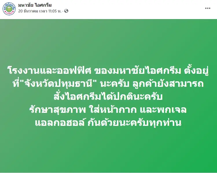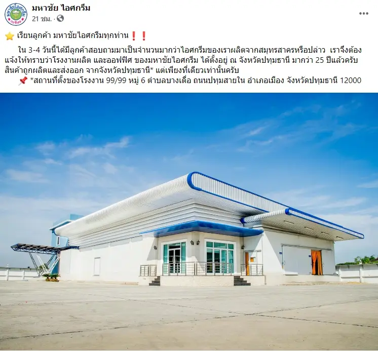 มหาชัย ไอศกรีม แจงแล้ว หลังจากชาวเน็ตเข้าใจผิดว่าอยู่ที่ มหาชัย สมุทรสาคร แต่ความจริงตั้งอยู่ปทุมธานี สามารถสั่งได้ปกติไม่มีปัญหา
