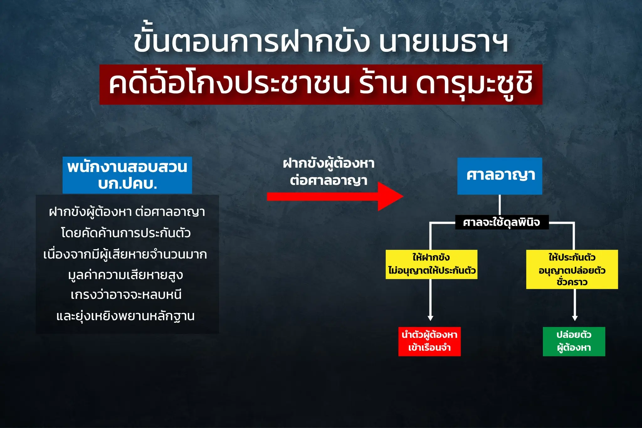 นายเมธา : ไม่อนุญาตให้ประกันตัว นายเมธา เจ้าของ ดารุมะ ซูชิ ส่งตัวเข้าเรือนจำต่อไป เนื่องจากคดีดังกล่าว มีผู้เสียหายเป็นจำนวนมาก