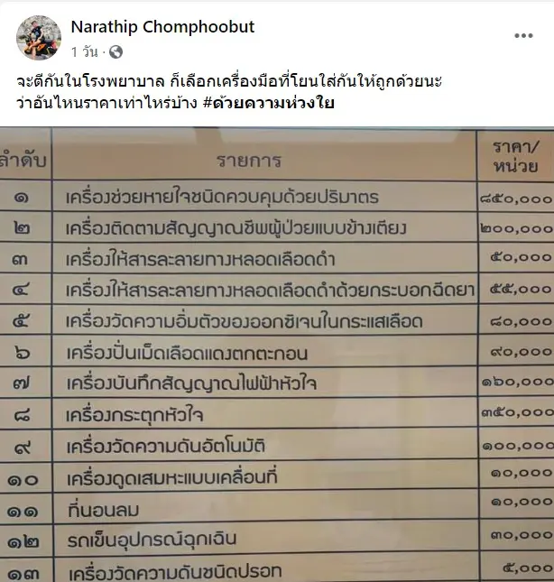 ต่อมาเมื่อวันที่ 20 ก.ค. ที่ผ่านมา ผู้ใช้เฟซบุ๊ก Narathip Chompoobut ซึ่งเป็นนักวิชาการสาธารณสุขปฏิบัติการ ที่โรงพยาบาลอำนาจเจริญ ได้ออกมาโพสต์เผยราคาของอุปกรณ์และเครื่องมือแพทย์ หลังเกิดเหตุกลุ่มวันรุ่นใช้อุปกรณ์ต่างๆของเจ้าหน้าที่เป็นอาวุธ โดยราคาที่มีราคาสูงสุดนั้นก็เป็นเครื่องช่วยหายใจชนิดควบคุมด้วยปริมาตร ที่สูงถึง 850,000 โดยผู้โพสต์ได้ระบุเอาไว้ว่า “จะตีกันในโรงพยาบาล ก็เลือกเเครื่องมือที่โยนใส่กันให้ถูกด้วยนะ ว่าอันไหนราคาเท่าไหร่บ้าง #fด้วยความห่วงใย”