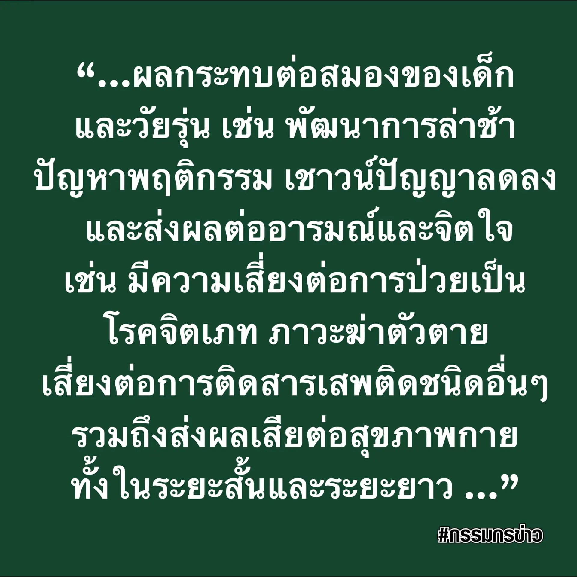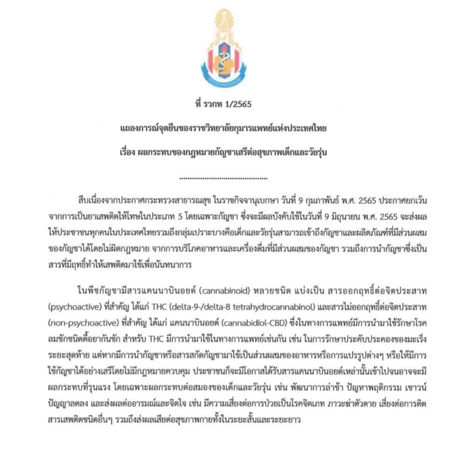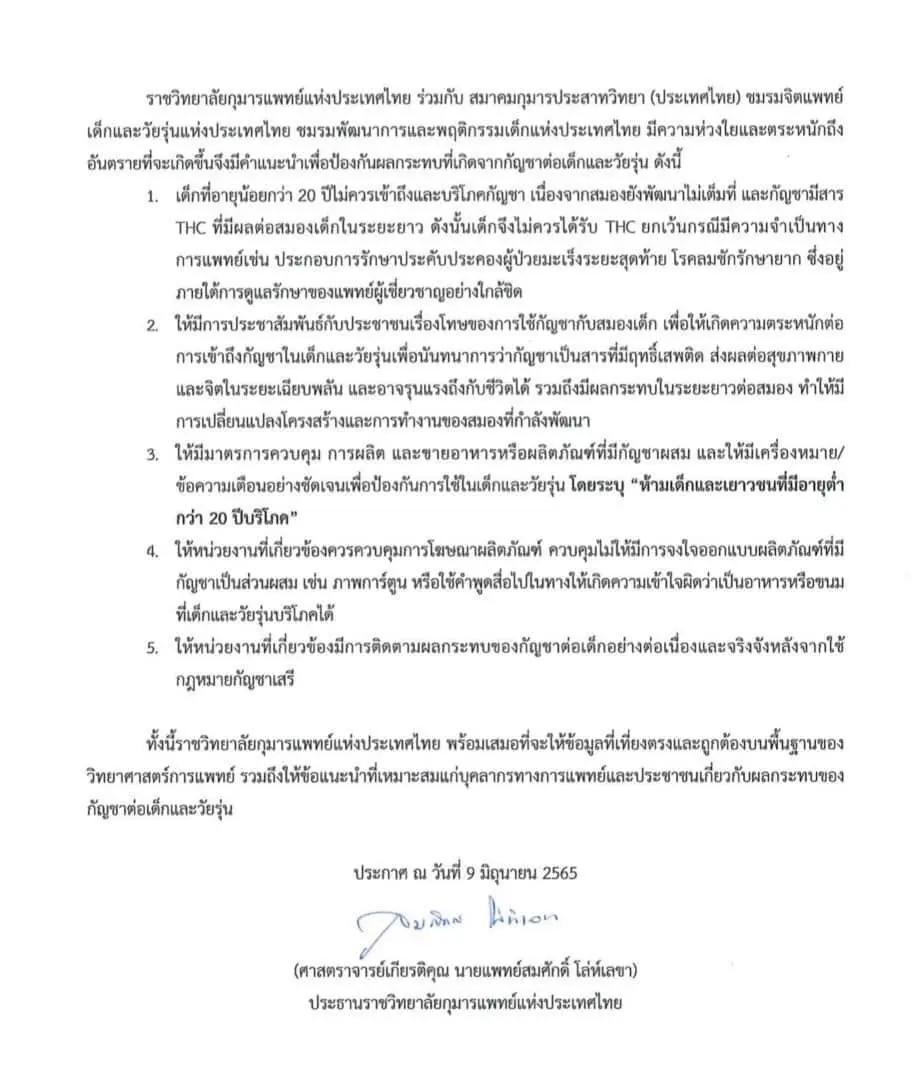 เรื่องผลกระทบของกฎหมายกัญชาเสรีต่อสุขภาพเด็กและวัยรุ่น ลงวันที่ 9 มิถุนายน พ.ศ. 2565