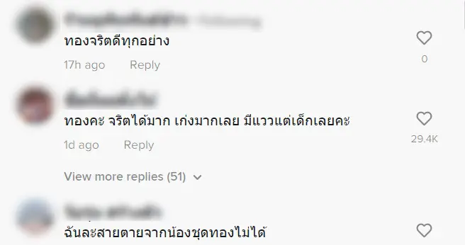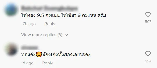 ทั้งนี้เจ้าของคลิปได้ตั้งคำถามแบบสนุกๆไว้ว่า “จริตการเดินให้คนไหนดี เขียว หรือ ทอง” ซึ่งชาวเน็ตส่วนใหญ่ต่างให้คะแนนชุดทองมากกว่า ซึ่งชาวเน็ตบางคนกล่าวว่าชุดเขียวสะดุดซะก่อนเลยเดินได้ไม่ดีพอ แต่อย่างไรก็ตามการเดินของทั้งคู่แทบไม่แพ้กันเลย