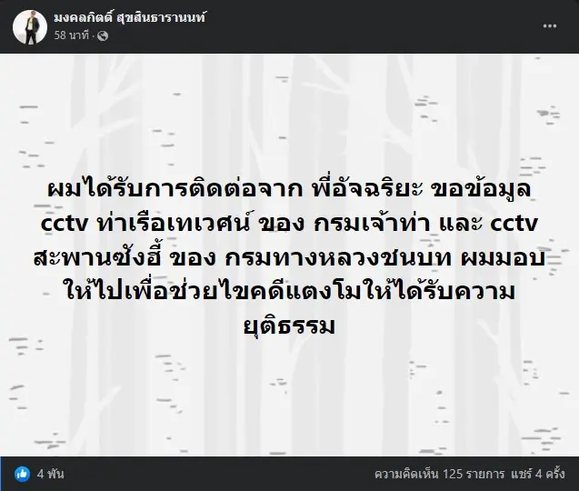 ผมได้รับการติดต่อจาก พี่อัจฉริยะ ขอข้อมูล cctv ท่าเรือเทเวศน์ ของ กรมเจ้าท่า และ cctv สะพานซังฮี้ ของ กรมทางหลวงชนบท ผมมอบให้ไปเพื่อช่วยไขคดีแตงโมให้ได้รับความยุติธรรม
