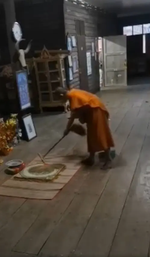 อย่างในกรณีนี้ ผู้ใช้เฟซบุ๊กส่วนตัวรายหนึ่ง โพสต์คลิปกล้องวงจรปิดบรรยากาศภายในกุฏิวัดแห่งหนึ่ง จับภาพเรื่องราวสุดหลอนของหลวงพี่องค์หนึ่งที่กำลังกวาดพื้นทำความสะอาดอยู่ แต่จู่ๆกลับเกิดเหตุการณ์ไม่คาดคิดขึ้น เมื่อไม้กวาดที่ใช้อยู่นั้นหายไปและโผล่กลับมาแบบงงๆ