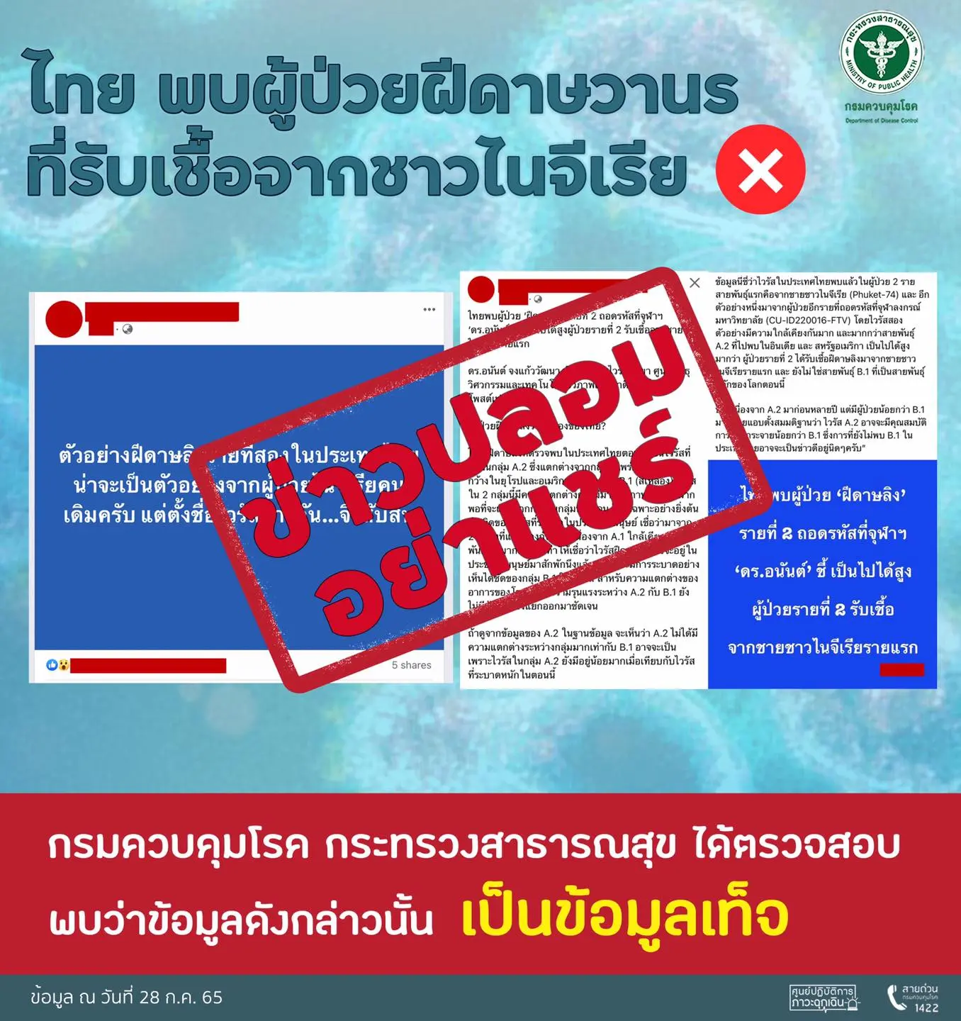 กรณีผู้ป่วยฝีดาษลิง รายแรกของกรุงเทพมหานคร กรมควบคุมโรค ได้ตรวจสอบยืนยันแล้วว่าเป็นข้อมูลเท็จ ไม่ได้รับเชื้อ ฝีดาษลิง จากชาวไนจีเรีย