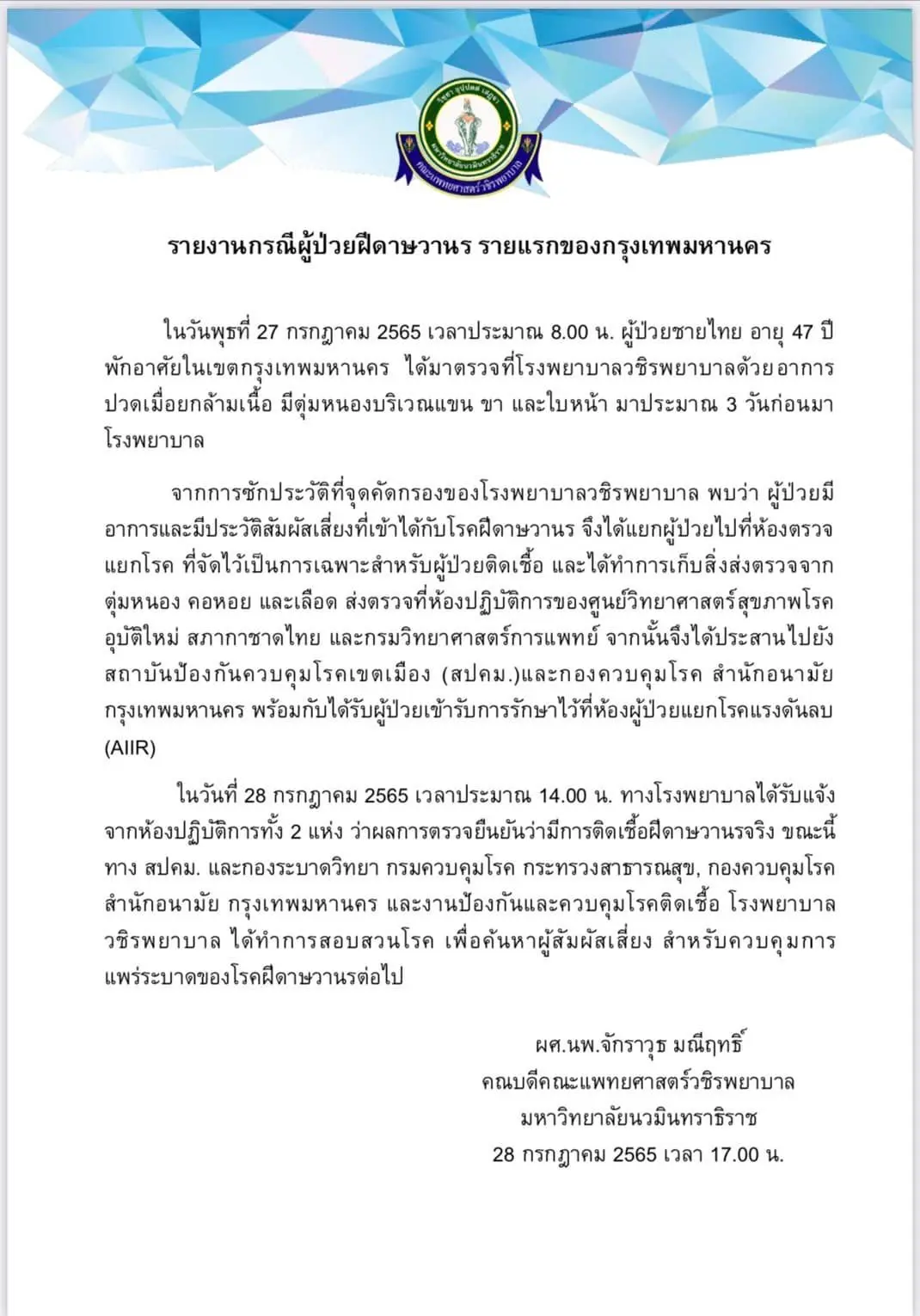 28 กรกฎาคม 2565 คณะแพทยศาสตร์วชิรพยาบาล มีรายงานกรณีผู้ป่วยฝีดาษลิง รายแรกของกรุงเทพมหานคร
