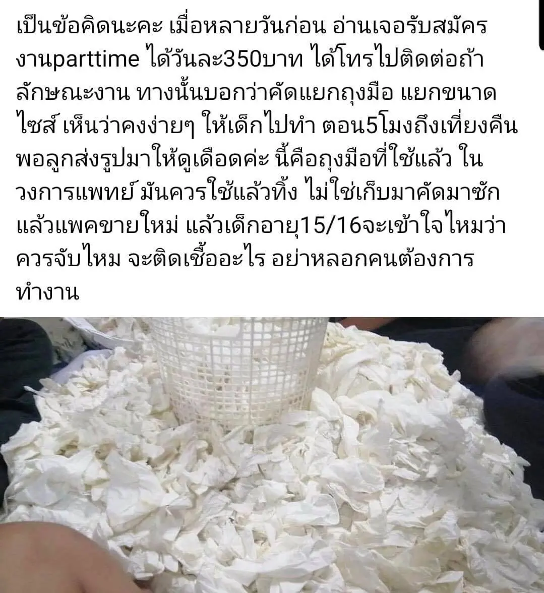 “มีลูกเพจส่งข้อความมาเล่าและฝากเป็นข้อคิดว่า “เมื่อหลายวันก่อน อ่านเจอรับสมัครงานพาร์ทไทม์ ได้วันละ 350 บาท จึงลองโทร.ไปติดต่อ โดยลักษณะงาน ทางนั้นบอกว่าคัดแยกถุงมือ แยกขนาดไซส์ เห็นว่าคงง่ายๆ ให้เด็กไปทำ ทำงานเวลา 17.00-00.00 น. พอลูกส่งรูปมาให้ดูเดือดเลยนี้คือถุงมือที่ใช้แล้ว ในวงการแพทย์มันควรใช้แล้วทิ้ง ไม่ใช่เก็บมาคัด มาซัก และกลับมาขายใหม่ แล้วเด็กอายุ 15, 16 ปี จะเข้าใจไหมว่าควรจับไหม จะติดเชื้ออะไร อย่าหลอกคนต้องการทำงาน