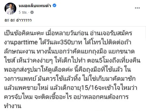 หมอแล็บแพนด้า โพสต์เตือนภัยพบกลุ่มคนจ้างงานพาร์ทไทม์ วันละ 350 บาท ให้คัดถุงมือการแพทย์ใช้แล้ว เพื่อนำมาหลอกขายใหม่