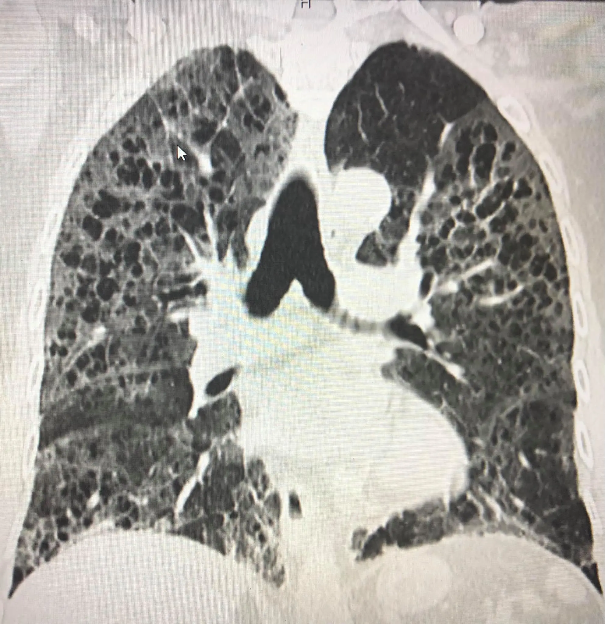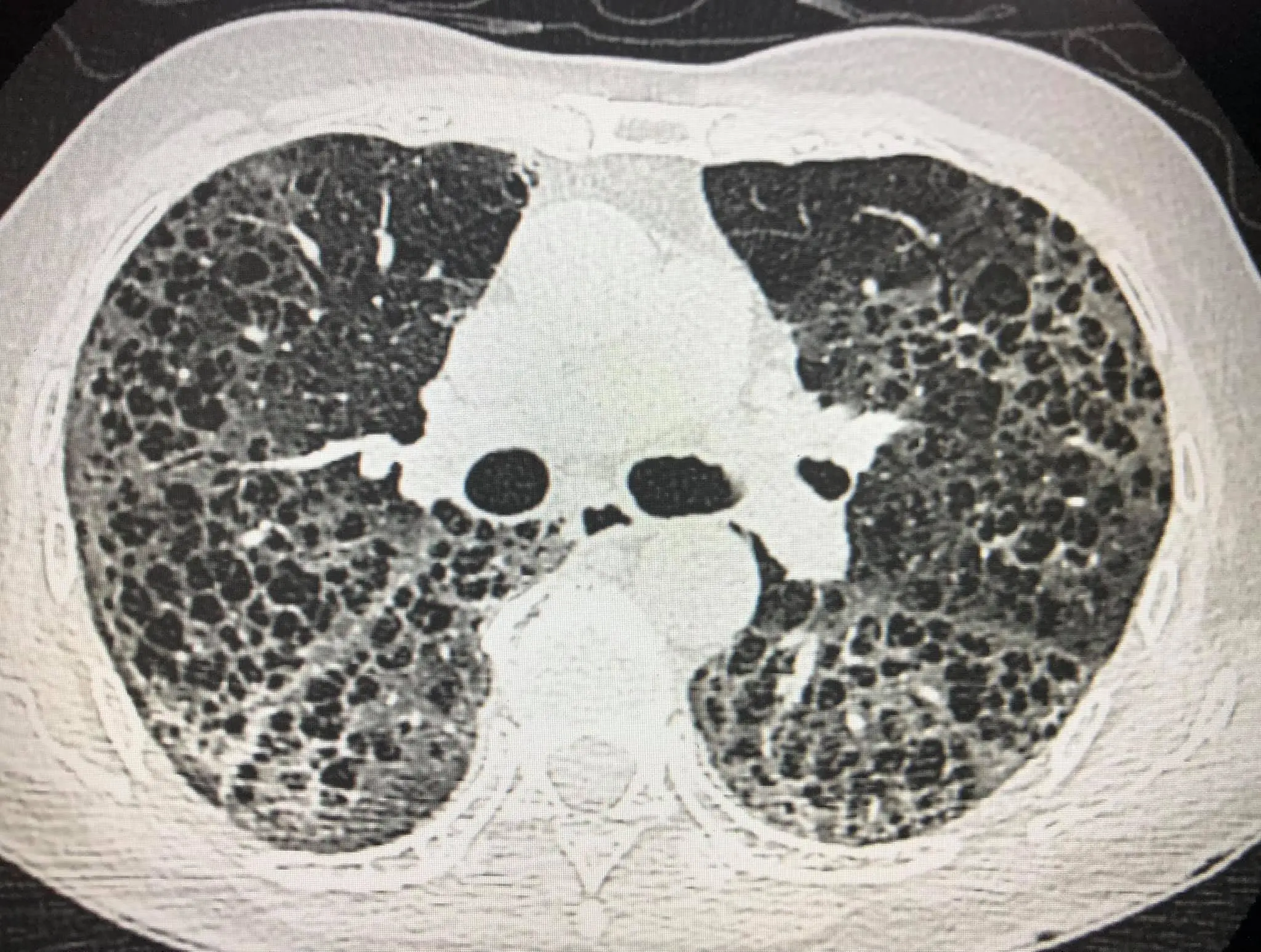 ผู้ป่วยชายไทยอายุ 80 ปี ปกติแข็งแรงดี ไม่มีประวัติป่วยเป็นโรคปอด ไม่สูบบุหรี่ เมื่อวันที่ 16 เมษายน 2564 ป่วยเป็นโรคโควิด-19 โดยลูกเป็นคนนำเชื้อมาให้ผู้ป่วยและคนในครอบครัวรวมทั้งหมด 7 คน เข้านอนรักษาในโรงพยาบาลด้วยปอดอักเสบรุนแรง เอกซเรย์ปอดมีฝ้าขาวทั้ง 2 ข้าง (ดูรูป) ทำคอมพิวเตอร์สแกนปอดพบเนื้อเยื่อปอดอักเสบรุนแรง มีทั้งฝ้าขาว รอยโรคเหมือนร่างแห และลักษณะผิดปกติคล้ายรังผึ้ง กระจายทั่วปอด (ดูรูป) ผู้ป่วยได้รับการรักษาเต็มที่ โชคดีที่ไม่ต้องใส่เครื่องช่วยหายใจ ต้องใช้ออกซิเจนมากถึง 10 ลิตร/นาทีตลอดเวลา นอนในรพ.ถึงวันที่ 22 พฤษภาคม 2564