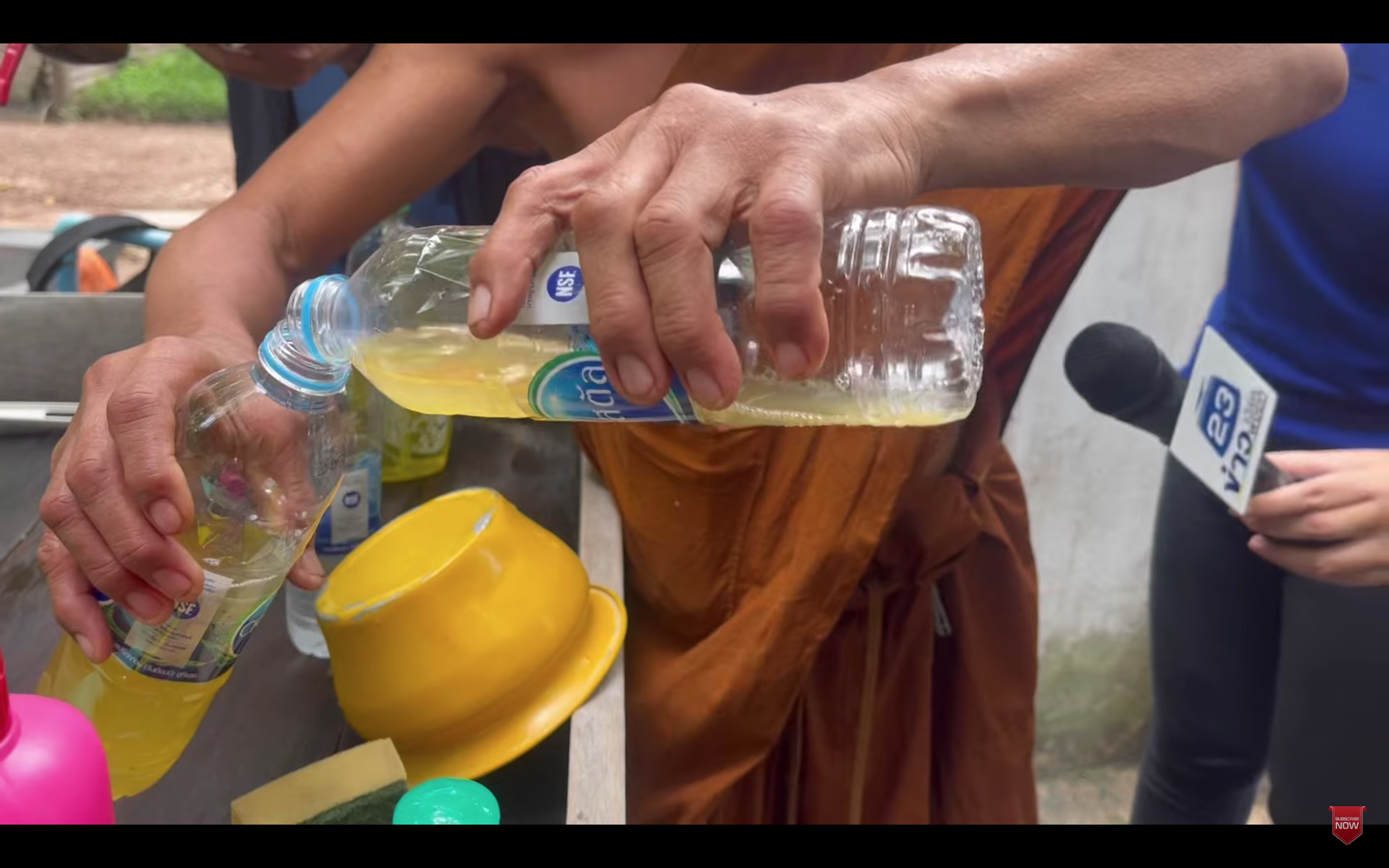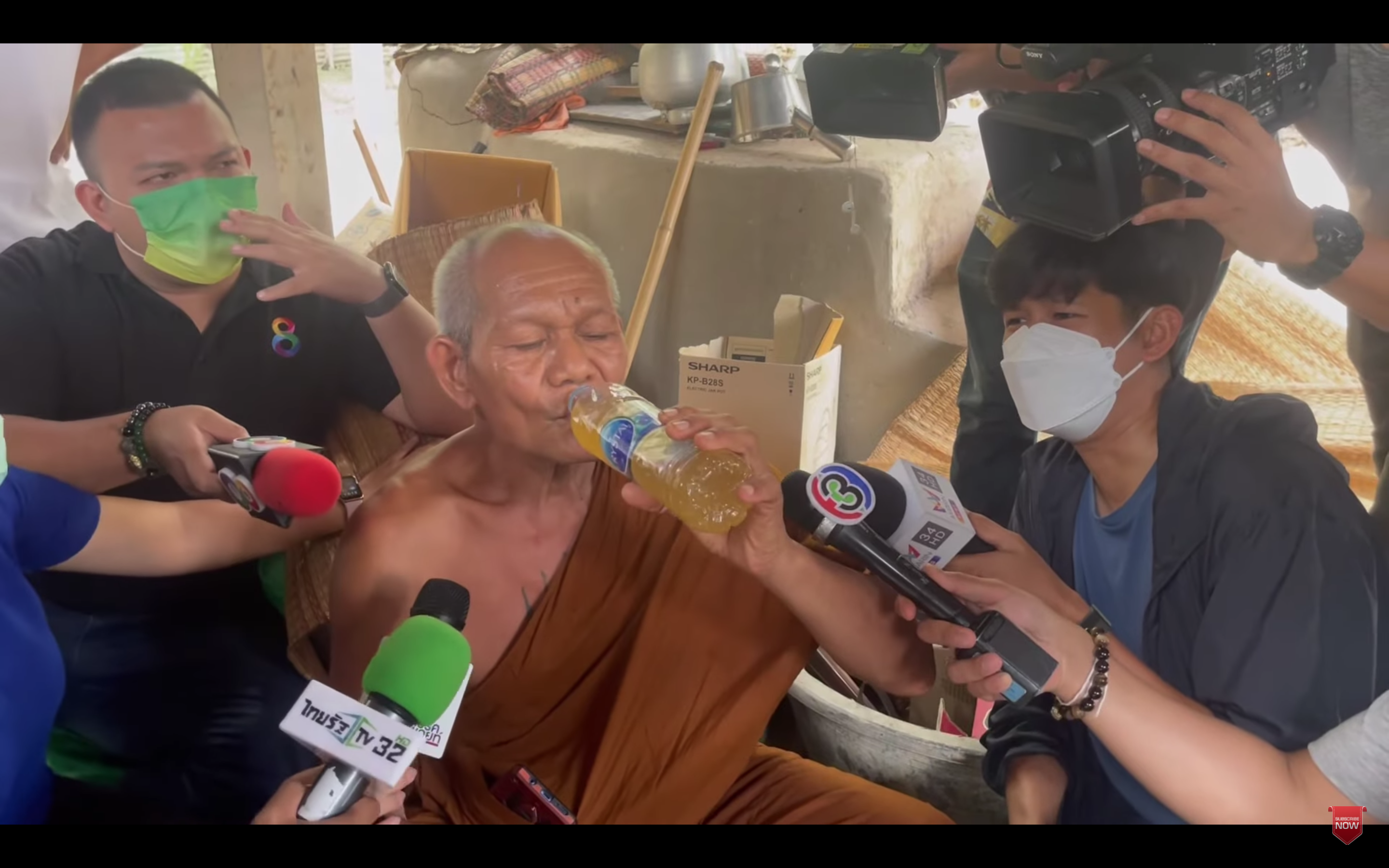 ขณะที่พระลูกวัดนำ ‘โถฉี่ของหลวงปู่ ‘ มาเทใส่ขวดน้ำพร้อมกับดื่มโชว์ต่อหน้านักข่าว โดยดื่มจนหมดขวด พร้อมบอกว่าอยู่กับหลวงปู่มานานเป็นสิบปี ดื่มปัสสาวะหลวงปู่ตลอดทุกวัน ก่อนดื่มต้องตั้งจิตอธิษฐาน เชื่อว่าฉี่หลวงปู่ ช่วยรักษาโรคนิ่วของตัวเองได้ โดยบอกกลิ่นและรสชาติปัสสาวะของหลวงปู่ไม่เหม็น หวาน หอมเหมือนเหมือนน้ำผลไม้ ถ้าไม่เชื่อลองดมดู ทำให้ผู้สื่อข่าวช่อง 3 และคนอื่นๆ ถึงกับพะอืดพะอม และพูดเป็นเสียงเดียวกันว่า “หนีกินฉี่พระบิดามาเจอกินฉี่หลวงปู่อีก”