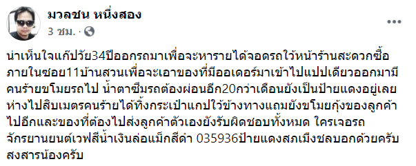 “น่าเห็นใจแก๊ปวัย34ปีออกรถมาเพื่อจะหารายได้จอดรถใว้หน้าร้านสะดวกซื้อภายในซอย11บ้านสวนเพื่อจะเอาของที่มีออเดอร์มาเข้าไปแปปเดียวออกมามีคนร้ายขโมยรถไป น้ำตาซึมรถต้องผ่อนอีก20กว่าเดือนยังเป็นป้ายแดงอยู่เลย