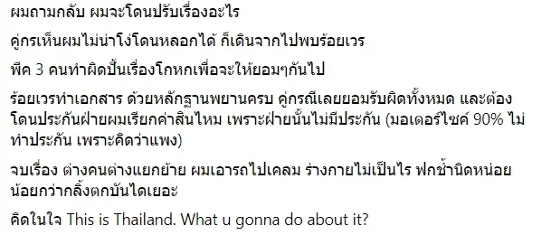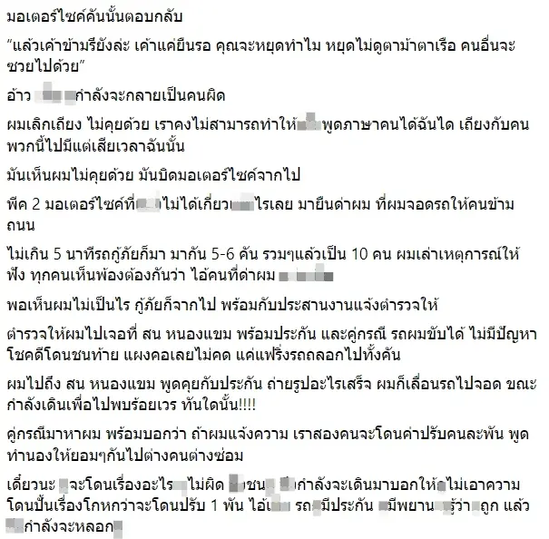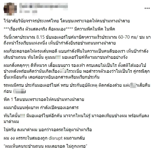 ระหว่างจัดเตรียมเอกสารเพื่อเรียกประกันพบว่ามีผู้ขับขี่รถจักรยานยนต์อีกคันขับเข้ามาต่อว่าตน “จอดรถไม่ดูตาม้าตาเรือ” ก่อนที่ผู้เสียหายจะตอบกลับว่า “ผมเห็นคนจะข้ามถนน ผมเลยจอด ไม่ถูกเหรอ” แต่ก็ยังโดนต่อว่ากลับว่า “แล้วเค้าข้ามรึยังล่ะ เค้าแค่ยืนรอ คุณจะหยุดทำไม หยุดไม่ดูตาม้าตาเรือ คนอื่นจะซวยไปด้วย” เมื่อเห็นว่าการเจรจาไม่เป็นผล ผู้เสียหายถึงหยุดการสนทนา และคู่กรณีก็ได้ขับรถไป