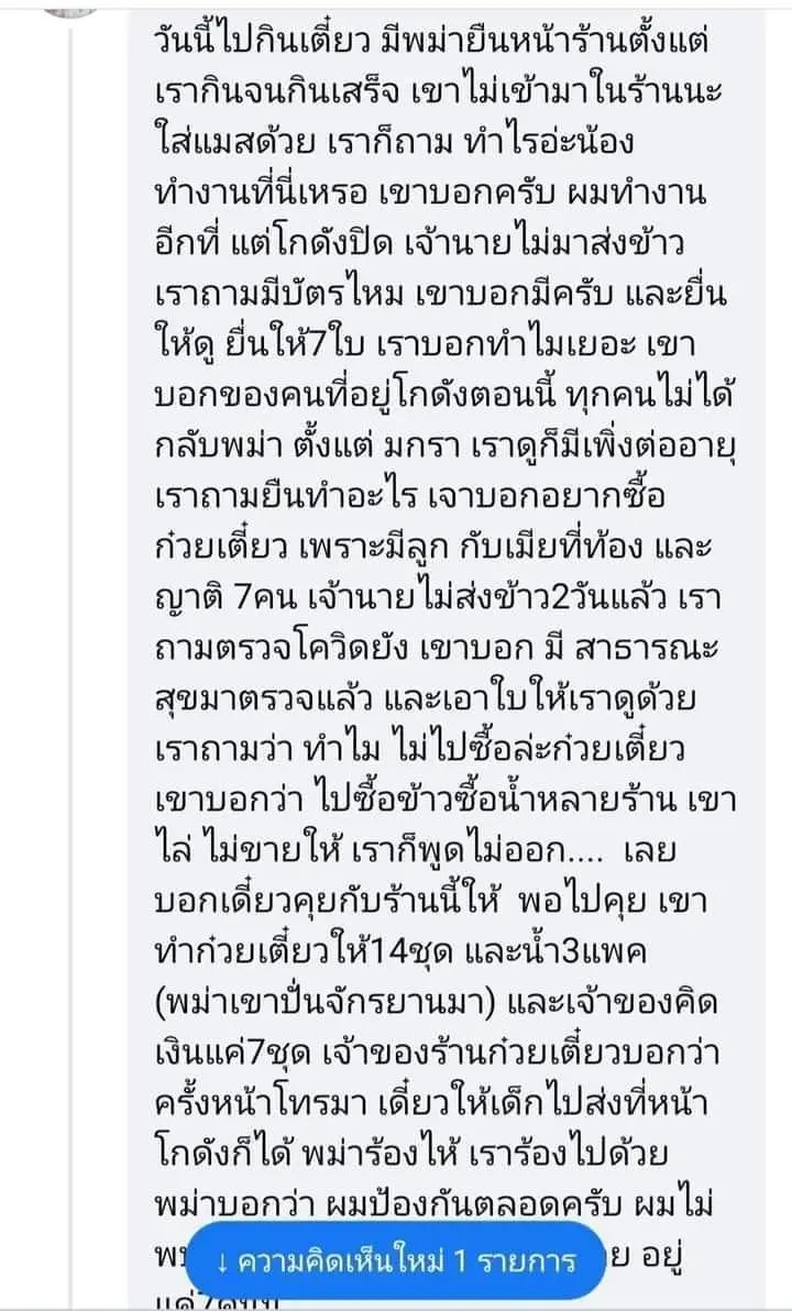 ล่าสุดผู้ใช้เฟซบุ๊กรายหนึ่ง เจ้าของร้านอาหารตามสั่งในพื้นที่กรุงเทพฯ ได้โพสต์ข้อความถึงแรงงานชาวพม่า ระบุว่า