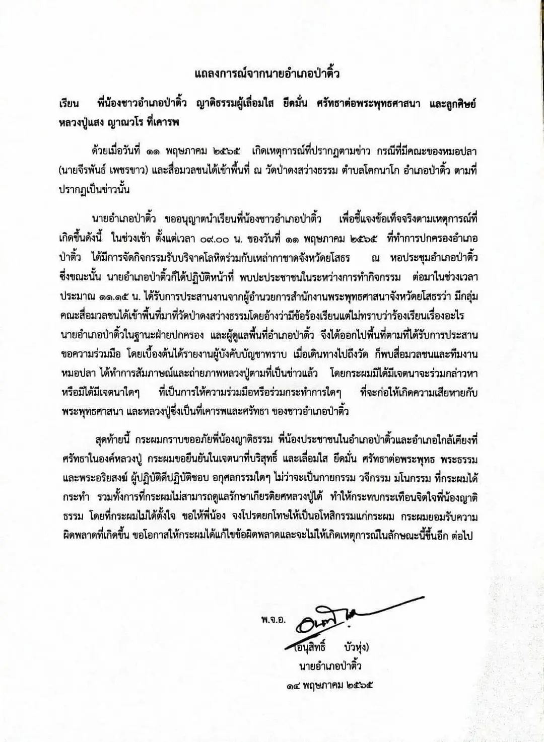 พ.จ.อ.อนุสิทธิ์ บัวหุ่ง นายอำเภอป่าติ้ว จ.ยโสธร ออกหนังสือแถลงการณ์ ขอขมา หลวงปู่แสง ที่ไม่ดูแลรักษาเกียรติยศหลวงปู่