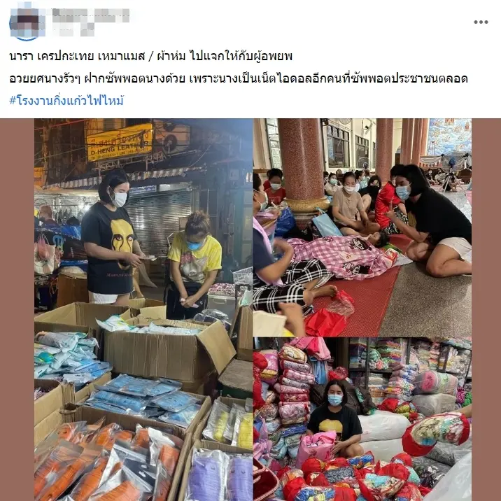 ชาวเน็ตแห่ชื่นชม นารา เครปกะเทย หลังหอบผ้าห่ม แมสก์ เข้าช่วยเหลือผู้อพยพ เหตุการณ์ โรงงานกิ่งแก้วไฟไหม้ สมุทรปราการ