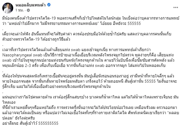 หมอแล็บแพนด้า โพสต์ผ่านเพจเฟซบุ๊กอธิบายข้อเท็จจริงเรื่องการตรวจหาเชื้อ โควิด19 ผ่านทางจมูก แบบถูกต้อง โดยระบุว่า “มีน้องคนนึงเค้าไปตรวจโควิด-19 พอตรวจเสร็จก็เข้าไปโพสต์ในไลน์กลุ่ม ในเชิงต่อว่าบุคลากรทางการแพทย์ว่า “แหย่เข้าไปลึกมาก ไม่มีจรรยาบรรณทางการแพทย์เลย” โอ้ยยย อีหยังวะ 555555