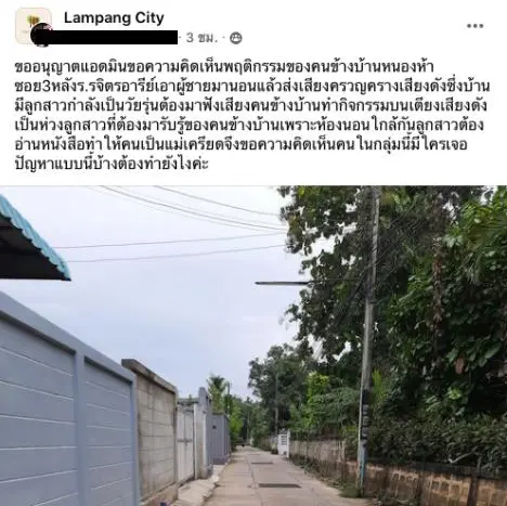 เรียกได้ว่ากำลังเป็นเรื่องราวไวรัลในเฟซบุ๊กขณะนี้ เมื่อมีคุณแม่รายหนึ่งได้โพสต์ระบายเกี่ยวกับพฤติกรรมคนข้างบ้านลงบนกลุ่มเฟซบุ๊ก lumpang city โดยเจ้าของเฟซบุ๊กระบุว่า