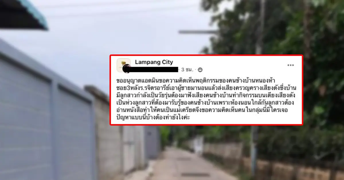 “ขออนุญาตแอดมินขอความคิดเห็นพฤติกรรมของคนข้างบ้านหนองห้า ซอย 3 หลังโรงเรียน เอาผู้ชายมานอนแล้วส่งเสียงครวญครางเสียงดัง ซึ่งบ้านมีลูกสาวกำลังเป็นวัยรุ่น ต้องมาฟังเสียงคนข้างบ้านทำกิจกรรมบนเตียงเสียงดัง เป็นห่วงลูกสาวที่ต้องมารับรู้เรื่องของคนข้างบ้านเพราะห้องนอนใกล้กัน ลูกสาวต้องอ่านหนังสือทำให้คนเป็นแม่เครียด จึงขอความคิดเห็นคนในกลุ่มนี้มีใครเจอปัญหาแบบนี้บ้าง ต้องทำยังไงคะ”