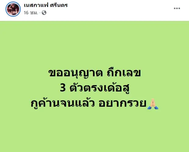 โดยก่อนหน้านี้ เซียนเนสกาแฟ ได้โพสต์ข้อความและรูปภาพในเฟซบุ๊ก “เนสกาแฟ ศรีนคร” ระบุว่า เย้ ปลดได้แล้ว, ขออนุญาต ถืกเลข 3 ตัวตรงเด้อสูกูค้านจนแล้ว อยากรวย, 3ตัวตรงต้องมาแล้ว!!