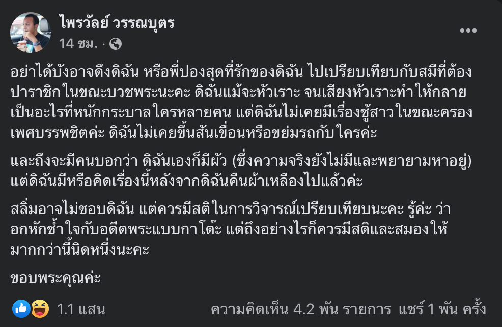 อย่าได้บังอาจดึงดิฉัน หรือพี่ปองสุดที่รักของดิฉัน ไปเปรียบเทียบกับสมีที่ต้องปาราชิกในขณะบวชพระนะคะ ดิฉันแม้จะหัวเราะ จนเสียงหัวเราะทำให้กลายเป็นอะไรที่หนักกระบาลใครหลายคน แต่ดิฉันไม่เคยมีเรื่องชู้สาวในขณะครองเพศบรรพชิตค่ะ ดิฉันไม่เคยขึ้นสันเขื่อนหรือขย่มรถกับใครค่ะ และถึงจะมีคนบอกว่า ดิฉันเองก็มีผัว (ซึ่งความจริงยังไม่มีและพยายามหาอยู่) แต่ดิฉันมีหรือคิดเรื่องนี้หลังจากดิฉันคืนผ้าเหลืองไปแล้วค่ะ สลิ่มอาจไม่ชอบดิฉัน แต่ควรมีสติในการวิจารณ์เปรียบเทียบนะคะ รู้ค่ะ ว่าอกหักช้ำใจกับอดีตพระแบบกาโต๊ะ แต่ถึงอย่างไรก็ควรมีสติและสมองให้มากกว่านี้นิดหนึ่งนะคะ ขอบพระคุณค่ะ