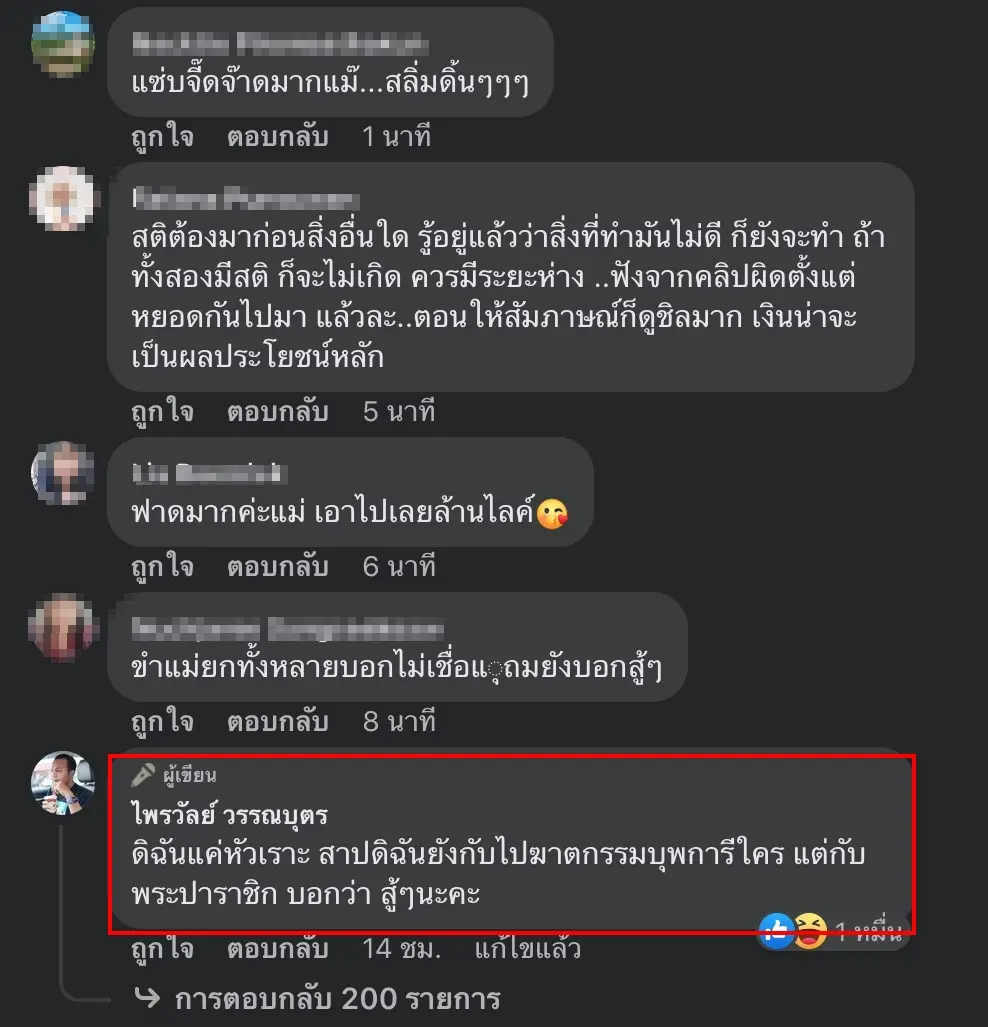 หลังจากโพสต์ดังกล่าว ทำให้เกิดความคิดเห็นหลากหลายแง่มุมจากชาวเน็ต ทั้งบอกว่า สติต้องมาก่อนสิ่งอื่นใด รู้อยู่แล้วว่าสิ่งที่ทำมันไม่ดี ก็ยังจะทำ ถ้าทั้งสองมีสติ ก็จะไม่เกิด ควรมีระยะห่าง ..ฟังจากคลิปผิดตั้งแต่หยอดกันไปมา แล้วละ..ตอนให้สัมภาษณ์ก็ดูชิลมาก เงินน่าจะเป็นผลประโยชน์หลัก