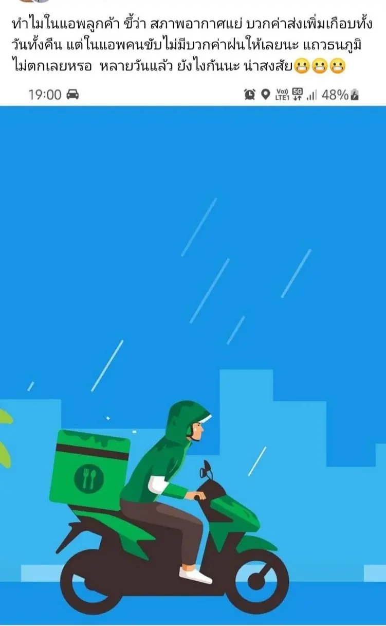 ทำเอาลูกค้าและไรเดอร์ตั้งข้อสงสัย ถึงเงินที่บวกเพิ่มในค่าสภาพอากาศย่ำแย่ ไรเดอร์ไม่ได้ แล้วเงินที่เก็บเพิ่ม ไปอยู่ที่ไหน?