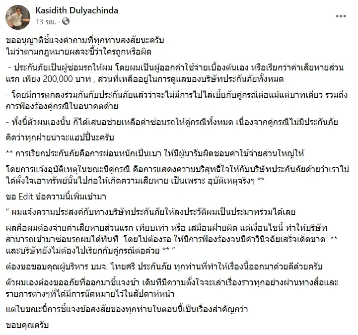 พร้อมกับได้ระบุข้อความเพิ่มเติมอีกว่า “ ผมแจ้งความประสงค์กับทางบริษัทประกันภัยให้ลงประวัติผมเป็นประมาทร่วมได้เลย ผลคือผมต้องจ่ายค่าเสียหายส่วนแรก เทียบเท่า หรือ เสมือนฝ่ายผิด แต่เงื่อนไขนี้ ทำให้บริษัทสามารถเข้ามาซ่อมรถผมได้ทันที โดยไม่ต้องรอ ให้มีการฟ้องร้องจนมีคำวินิจฉัยเสร็จเด็ดขาด ** และบริษัทยังไม่ต้องไปเรียกกับคู่กรณีต่อด้วย