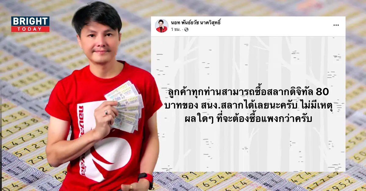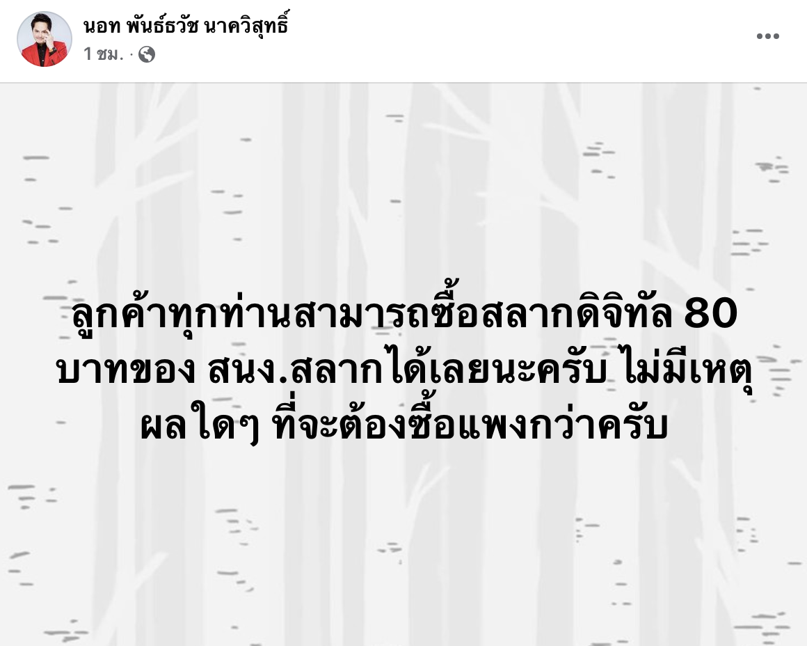 อีกหนึ่งความเคลื่อนไหวหลังจากประกาศรางวัลสลากกินแบ่งรัฐบาล งวดวันที่ 1 มิถุนายน 2565 จากทางด้านเพจเฟซบุ๊ก นอท พันธ์ธวัช นาควิสุทธิ์ เมื่อวันที่ 2 มิถุนายน 2565 โพสต์ข้อความระบุว่า ลูกค้าทุกท่านสามารถซื้อสลากดิจิทัล 80 บาทของ สนง.สลากได้เลยนะครับ ไม่มีเหตุผลใดๆ ที่จะต้องซื้อแพงกว่าครับ