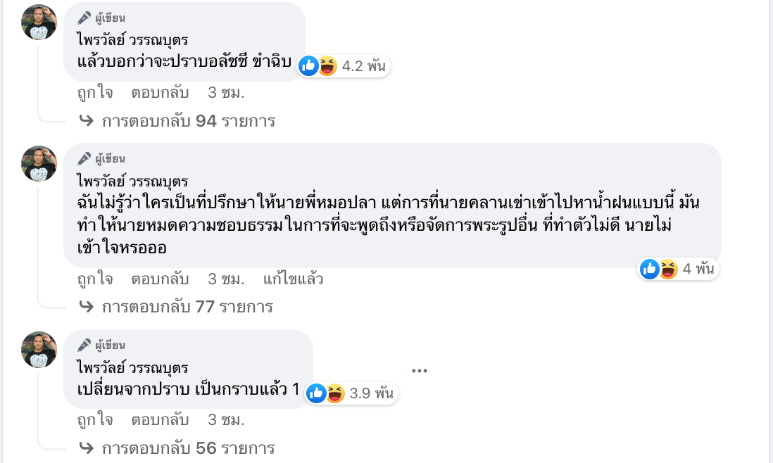 “จบค่ะ แล้วทีหลังไม่ต้องเสนอไปจัดการพระวัดไหนอีกนะหมอปลา ไม่ต้องพูดเรื่องไสยศาสตร์ เรื่องความงมงาย เรื่องพระอลัชชี เรื่องพุทธไม่พุทธอะไร ไม่ต้องมาทำเป็นห่วงใยพุทธศาสนา ทุกอย่างก็คงแค่เรื่องของคอนเทนต์ อุดมกงอุดมการณ์ ถูกราดลงโถส้วมไปหมดแล้ว
