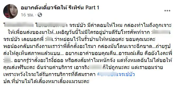 เมื่อวันที่ 31 สิงหาคมที่ผ่านมา เพจเฟซบุ๊ก อยากดังเดี๋ยวจัดให้ รีเทิร์น Part 1 ได้โพสต์ภาพพร้อมข้อความจากแฟนเพจท่านหนึ่ง ที่ได้ทำการสั่งของและใช้บริการขนส่งชื่อดัง แต่พอของมาถึง กลับพบว่ากล่องโดยเจาะจนเป็นรูใหญ่ พร้อมกล่าวว่าเสียความรู้สึก ยอมจ่ายแพงเพราะอยากได้บริการที่ดี ไม่ได้ขอให้ส่งฟรี โดยในโพสต์ระบุว่า