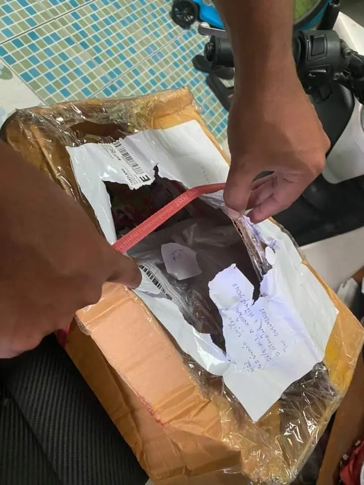 ‘ไ….ไท.. ไ….สาขา จรเข้บัว มีคำตอบให้ไหม กล่องทำไมถึงถูกเจาะ ให้เพื่อนส่งของมาให้..เผอิญวันนี้ไม่มีใครอยู่บ้านดีรับโทรศัพท์จาก ป… จรเข้บัว เลยบอกพี่ ….ว่าหย่อนไว้ในรั้วบ้านให้หน่อยค่ะ ขอบคุณนะคะ
