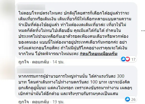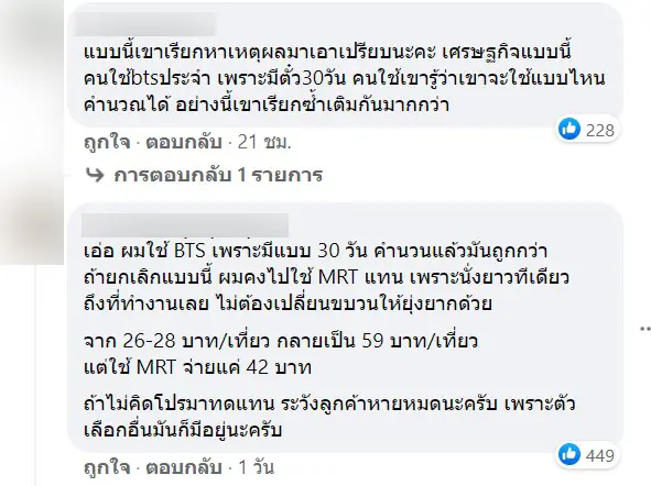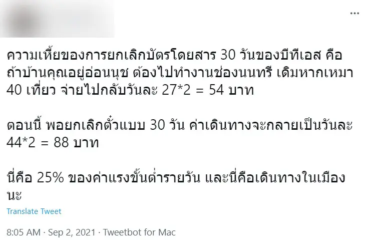 โดยบางท่านระบุว่า ถ้ายกเลิกบัตร 30 วัน แล้วต้องเดินทางไปทำงานไกล ๆ เดิมเหมา ๆ ไปกลับจ่ายแค่ 50 กว่าบาท แล้วถ้ายกเลิกก็จะกลายเป็นไปกลับจ่าย 80 บาท เกือบเท่าตัว ซึ่งบางคนอาจจะมีค่าใช้จ่ายที่เยอะกว่านี้ นั้นหมายถึงไม่สอดคล้องกับค่าอรงขั้นต่ำวันละ 300 บาท