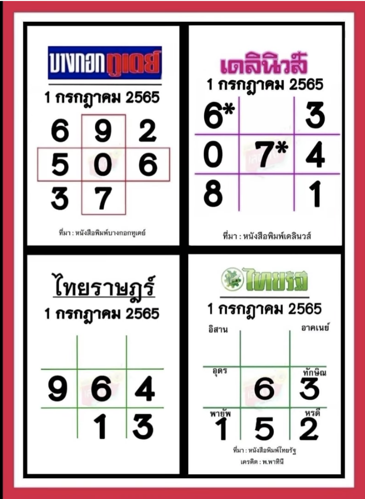 ก่อนหน้านี้ ไบร์ททูเดย์ (bright today) นำเสนอ อย่างเลขเด็ดจากหนังสือพิมพ์ 3 สำนักดังอย่าง ไทยรัฐ เดลินิวส์ บางกอกทูเดย์ เป็นที่เรียบร้อย เจอเลขชนกันถึง 2 ตัว นั้นก็คือ 3 / 6 แนวทางสลากกินแบ่งรัฐบาลงวดวันที่ 1 กรกฎาคม 2565 หากชอบก็ตามด่วน ไม่ชอบก็ปล่อยได้ ซึ่งมั้งสามสำนักนี้ต่างก็มีผลงานที่น่าประทับใจอยู่หลายงวด ทำให้เป็นที่จับตาของใครหลายๆคน