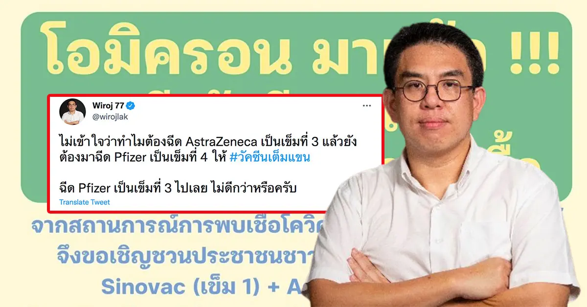 โดยทางด้านของทวิตเตอร์ @wirojlak ของคุณวิโรจน์ ลักขณาอดิศร ส.ส. พรรคก้าวไกล ทวิตเตอร์ข้อความเชิงตั้งคำถาม เกี่ยวกับการบูสเตอร์วัคซีนแอสตร้าเซนเนก้า และแถมวัคซีนไฟเซอร์ เป็นวัคซีนเข็มที่ 4