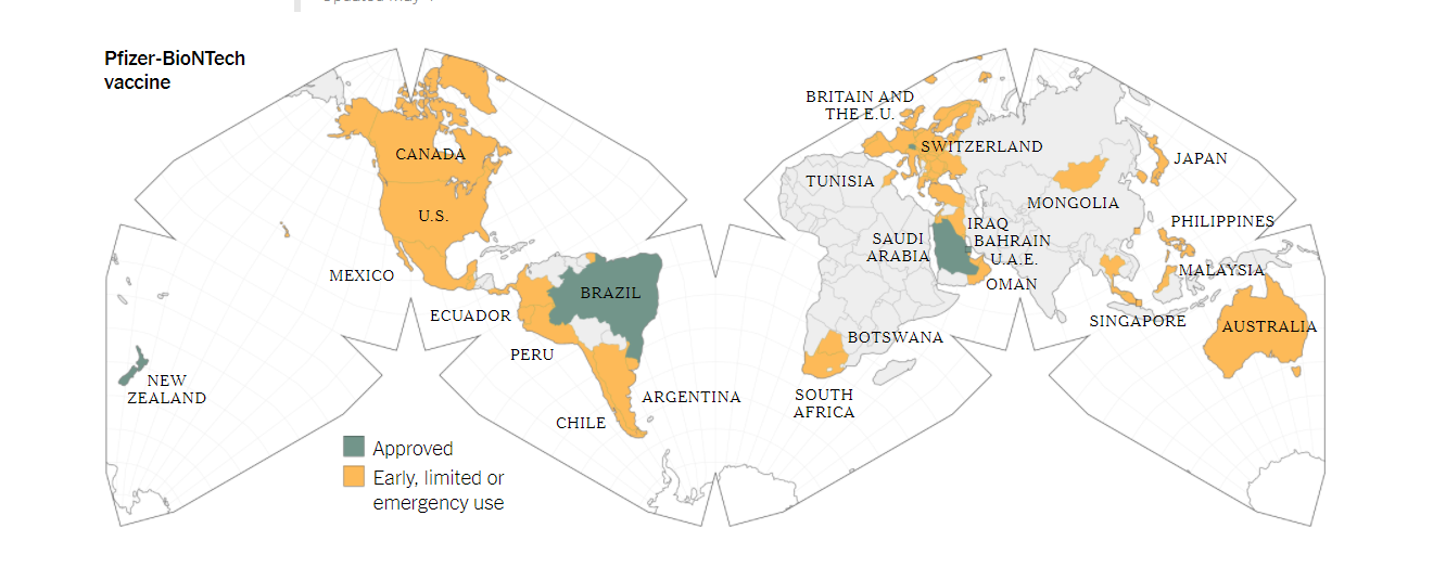 และอีกหนุ่งเว็บเว็บไซต์อย่าง www.nytimes.com ที่ให้ข้อมูลเกี่ยวกับว่า วัคซีนPfizer ได้รับการอนุญาติให้ใข้แบบฉุกเฉินได้แล้วในประเทศไทย พร้อมกับอีกกว่า 46 ประเทศ ทั้วโลก