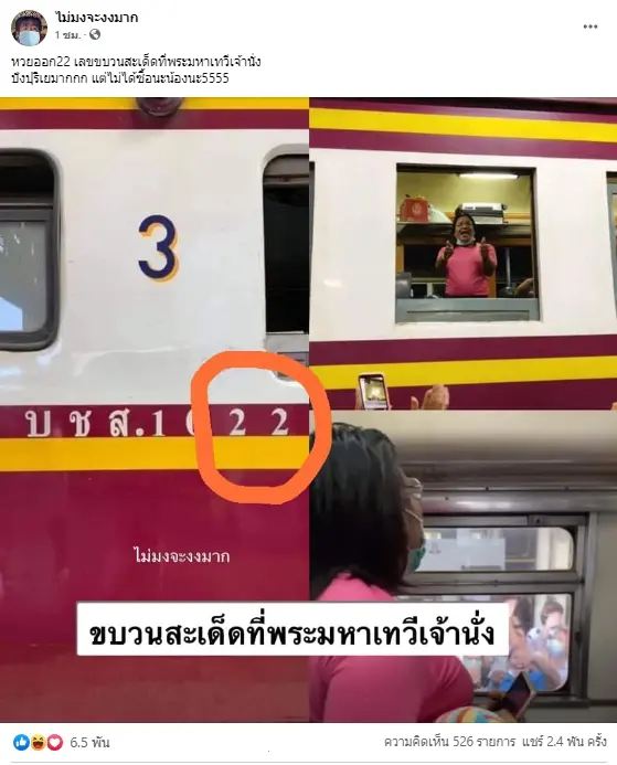 ล่าสุด หลังจากที่สลากกินแบ่งรัฐบาลได้ออกเลขประจำวันที่ 16 มีนาคม 2564 ซึ่งเลขที่ออกมาสองตัวท้าย ตรงกับเลขรถไฟที่พระมาหาเทวีเจ้าได้ประทับมานั่นเอง ซึ่งเฟซบุ๊กเพจ ไม่มงจะงงมาก ได้โพสต์รูปภาพของรถไฟขบวนดังกล่าว พร้อมระบุข้อความว่า “หวยออก22 เลขขบวนสะเด็ดที่พระมหาเทวีเจ้านั่ง ปังปุริเยมากกก แต่ไม่ได้ซื้อนะน้องนะ5555”