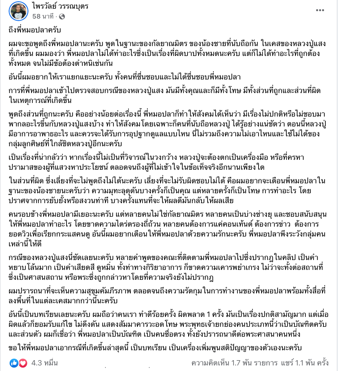 จากกรณี หมอปลาได้ออกมา live แถลง ผ่านเพจ จาก กรณีร้อนแรง หลวงปู่แสง ที่ส่งทีม นักข่าว ไปแอบถ่าย เข้าตรวจสอบพฤติกรรม หลวงปู่แสง ล่าสุดทางด้าน ไพรวัลย์ วรรณบุตร ก็ได้ออกมาโพสต์ฝากถึง หมอปลาในฐานะของกัลยาณมิตร ที่นับถือกัน ในเคสของหลวงปู่แสงที่เกิดขึ้น หมอปลาไม่ได้ทำอะไรซึ่งเป็นเรื่องที่ผิดบาปทั้งหมด แต่ก็ไม่ได้ทำอะไรที่ถูกต้องทั้งหมด จนไม่มีข้อต้องตำหนิเช่นกัน โดยได้ระบุข้อความภายในโพสต์ว่า