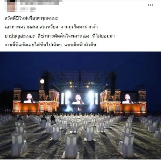 ชาวเน็ตถกสนั่นหลังโลกออนไลน์แชน์ภาพงาน เคาท์ดาวน์ภูเก็ต จัดงานใหญ่โตนักร้องแถวหน้าขึ้นร้องแต่ไร้เงาคนเข้าร่วมมีเพียงเก้าอี้เปล่าที่ถูกจัดไว้