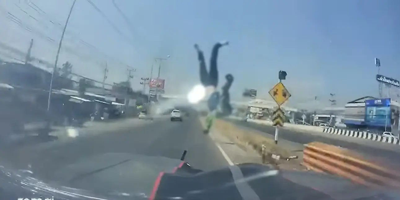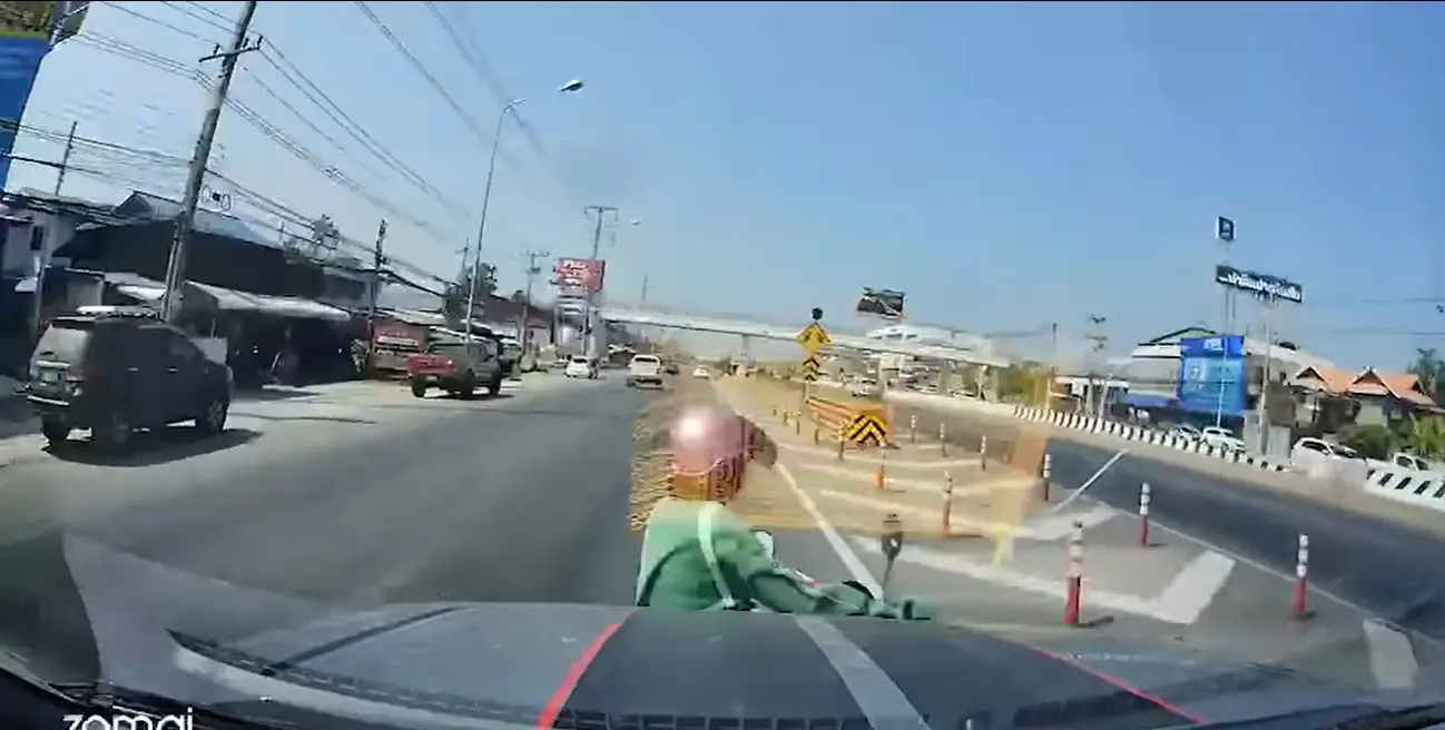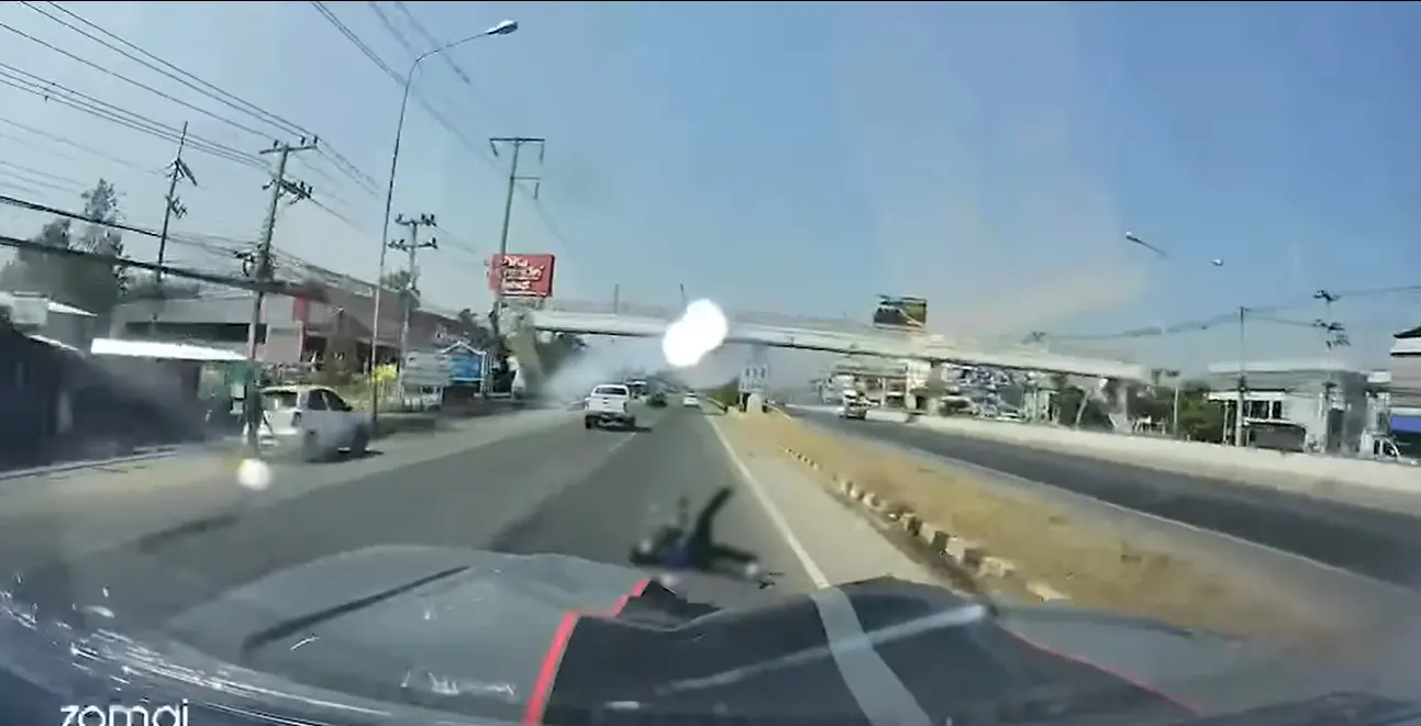 เตือนเป็นอุทาหรณ์ กระบะซิ่งชนมอเตอร์ไซค์ ที่วิ่งตัดหน้าออกมา จนรถกระบะไม่สามารถเบรกได้ทัน จึงพุ่งเข้าชนอย่างเต็มแรง ส่งผลให้ร่างปลิวลอยออกไปกระแทกกับพื้น ไถลไหลไปตามถนนหลายเมตร