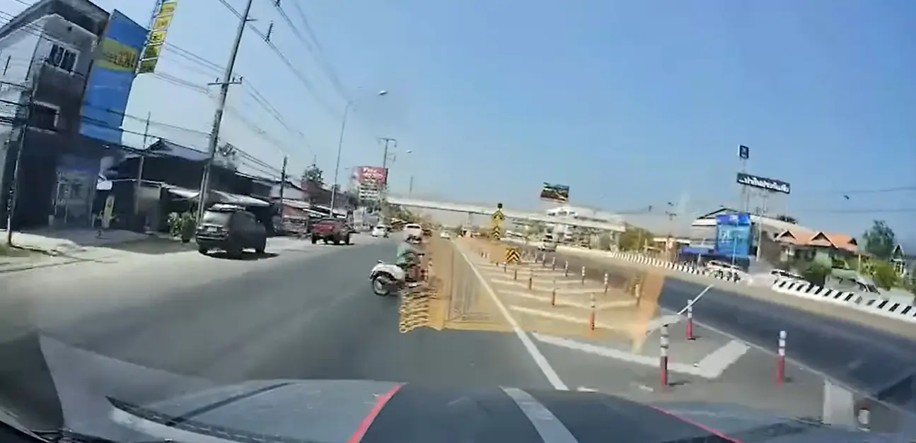 รถกระบะเลือกที่จะมุดแซงรถคั้นที่อยู่ข้างหน้า และไปวิ่งแซงบนเขตเส้นปลอดภัยตรงทางแยกพอดี เมื่อแซงรถดังกล่าวสำเร็จ ก็พบเจอรถมอเตอร์ไซค์พุ่งออกมาจากทางด้านซ้าย กำลังจะวิ่งตัดเส้นทางคู่ขนานเพื่อไปวิ่งบนทางหลัก ด้วยความกระชันชิด กระบะที่ขับมาเร็วเบรกไม่ทัน จึงพุ่งชนเข้าเต็มแรงกระเด็นไปไกลหลายเมตร ส่งผลให้คนขับมอเตอร์ไซค์เสียชีวิต