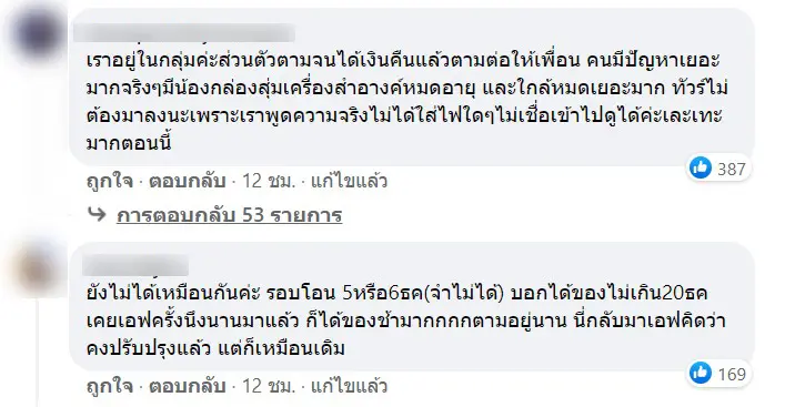 โดยหลังจากที่โพสต์ถูกแชร์ออกไป ก็ได้มีชาวเน็ตที่เป็นทั้งลูกค้าและคนที่เป็นลูกเพจ เข้ามาแสดงความคิดเห็นกันอย่างล้นหลาม บางท่านก็บอกว่า สั่งไปตั้งแต่วันที่ 5 ของเก่าไม่ยอมส่ง แต่ส่งกล่องสุ่ม รัก 1 กล่องละหมื่นบาท แถมเครื่องสำอางค์ในกล่องก็ยังผลิตตั้งแต่ ปี 2017-2018 เยอะมาก / รอมา 2 เดือนแล้วแอดมินไม่สนใจเลย หมดเงินไป 6 พัน ไม่ได้ของ แถมเสียเงินฟรี ไม่ได้คืน เสียใจเสียความรู้สึกมาก