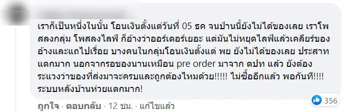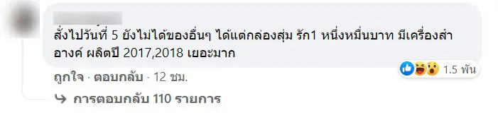 แอดมินเลื่อนส่งของแล้ว เลื่อนส่งของอีก สินค้าที่ได้รับ บางคนได้ชุดนอนหมดเลย 46 รายการ แล้วอ้างว่า รหัสผิด บางคนต้องรอเคอร์รี่เค้าไปรับของคืน ให้เวลามากสุด 2 เดือนเลยค่ะ กว่าแต่ละออเดอร์จะถูกต้องหลายคนไปเม้นในไลฟ์สด พรพ ที่ขายของ แต่นางปล่อยเบลอค่ะ ไม่อ่าน ไม่สนใจ ขายของอย่างเดียว