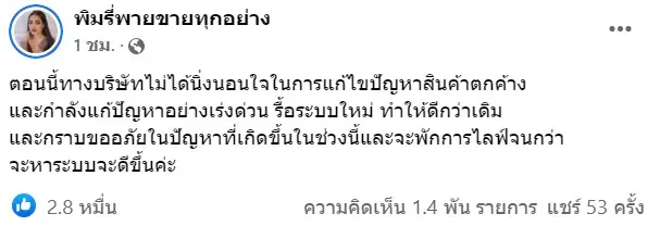 แม่ขอพัก! พิมรี่พาย ประกาศพักไลฟ์จนกว่าระบบจะดี หลังเจอมรสุมกล่องสุ่ม – ส่งช้า! ชี้ กำลังเร่งแก้ เตรียมรื้อระบบใหม่ กราบขออภัยลูกค้าทุกท่าน