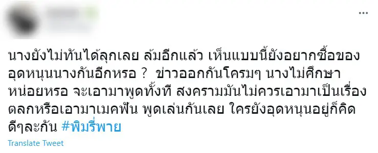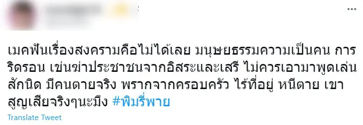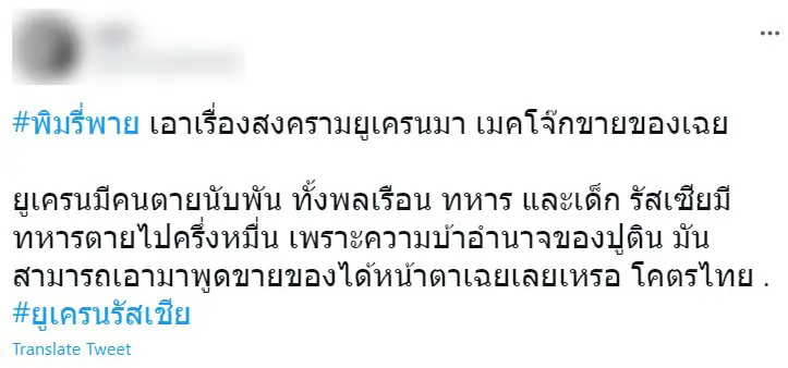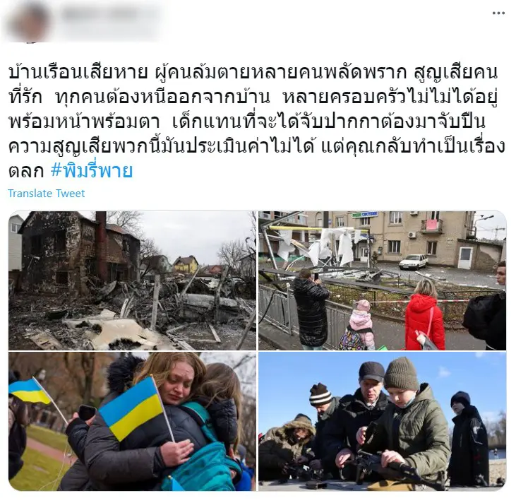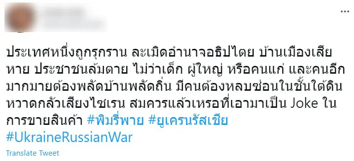 โดยผู้ใช้ทวิตเตอร์รายนี้ก็ได้เขียนแคปชั่นว่า ‘ประเทศหนึ่งถูกรุกราน ละเมิดอำนาจอธิปไตย บ้านเมืองเสียหาย ประชาชนล้มตาย ไม่ว่าเด็ก ผู้ใหญ่ หรือคนแก่ และคนอีกมากมายต้องพลัดบ้านพลัดถิ่น มีคนต้องหลบซ่อนในชั้นใต้ดิน หวาดกลัวเสียงไซเรน สมควรแล้วเหรอที่เอามาเป็น Joke ในการขายสินค้า’