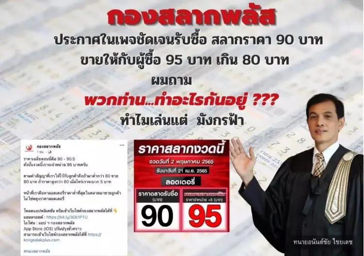 จากกรณีที่ เมื่อ 22 เม.ย. 65 เพจเฟซบุ๊ก กองสลากพลัส ได้เผยว่า “ราคาเฉลี่ยตอนนี้คือ 90 – 90.5 ดังนั้นงวดนี้เราจะจำหน่าย 95 บาท ตามคำสัญญาที่เราให้ไว้กับลูกค้าคือถ้ามาต่ำกว่า 80 ขาย 80 บาท ถ้าราคาสูงกว่า 80 เมื่อไหร่เราจะบวก 5 บาท หน้าที่เราคือหาลอตเตอรี่ราคาต่ำที่สุดในตลาดมาขายลูกค้าไม่ใช่พยุงราคาลอตเตอรี่ โดยได้ให้เหตุผลไว้ 3 ข้อเกี่ยวกับการจำหน่ายราคา 95 บาท”