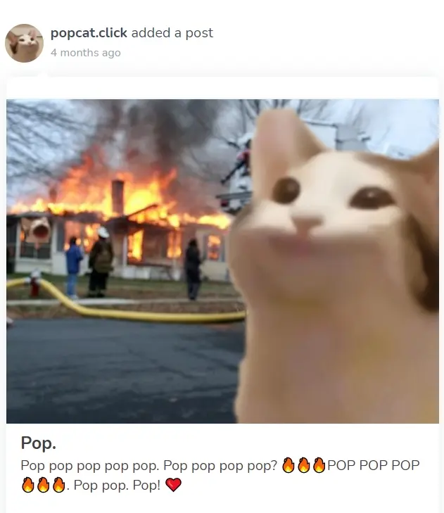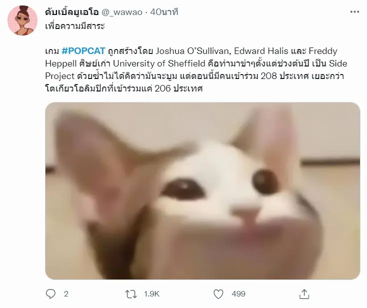 สำหรับเจ้า POPCAT ถูกสร้างโดย Joshua O’Sullivan, Edward Halis และ Freddy Heppell ศิษย์เก่า University of Sheffield ทำมาขำๆตั้งแต่ช่วงต้นปี เป็น Side Project ด้วยซ้ำไม่ได้คิดว่าจะบูม แต่ตอนนี้มีคนเข้าร่วม 208 ประเทศ เยอะกว่าโตเกียวโอลิมปิกที่เข้าร่วมแค่ 206 ประเทศ