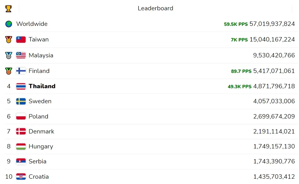 การแข่งขันดำเนินไปเรื่อยๆ อย่างไม่มีระยะเวลาสิ้นสุดการแข่งขัน ทำผู้ที่ครองอันดับ 1 ในตอนนี้คือไต้หวัน ส่วนอันดับ 2 กับ 3 ก็คือ มาเลเซีย และ ฟินแลนด์