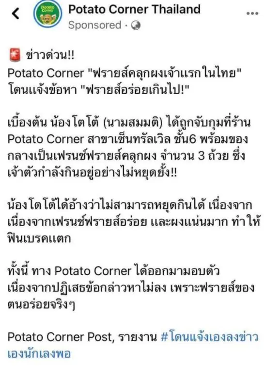 โดยข้อความในเพจเฟซบุ๊กของ Potato Corner Thailand ระบุว่า ข่าวด่วน!! Potato Corner